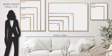 A general guideline is to choose art that is ½ – ¾ the width of the wall OR of the furniture it is being placed over. So if you have a couch that is 7 feet (84”) wide and want to hang one large statement piece above it, the art should be 42 – 63 inches wide.
